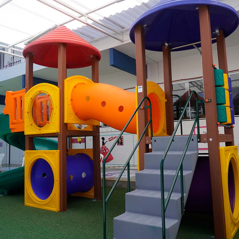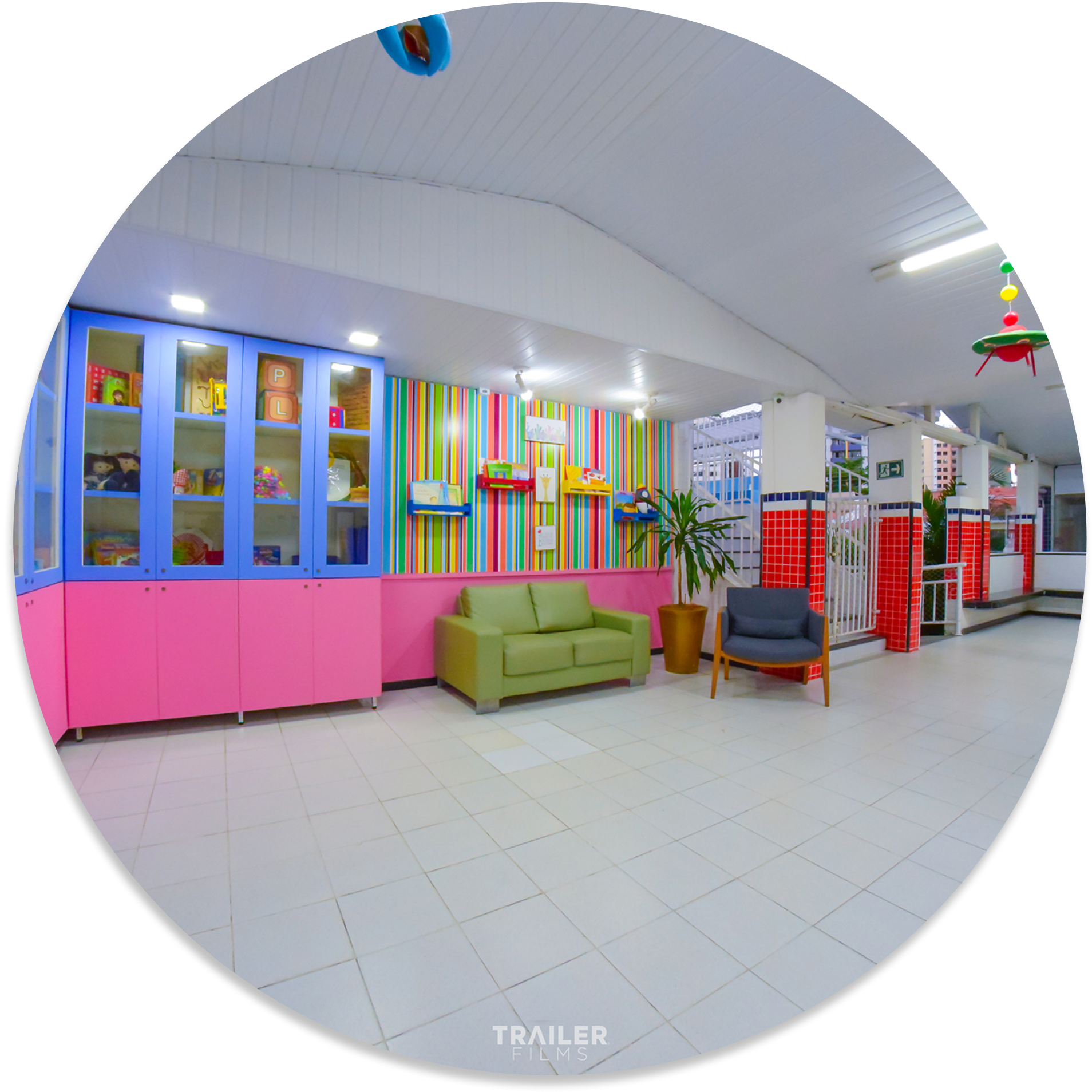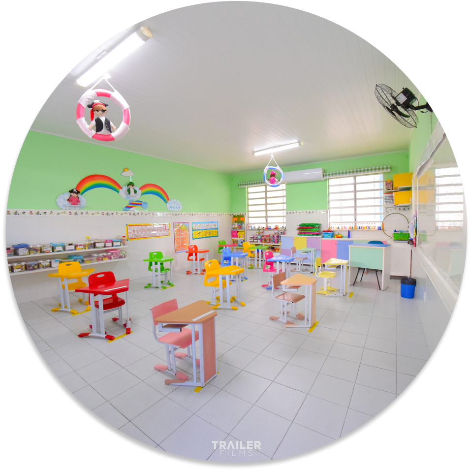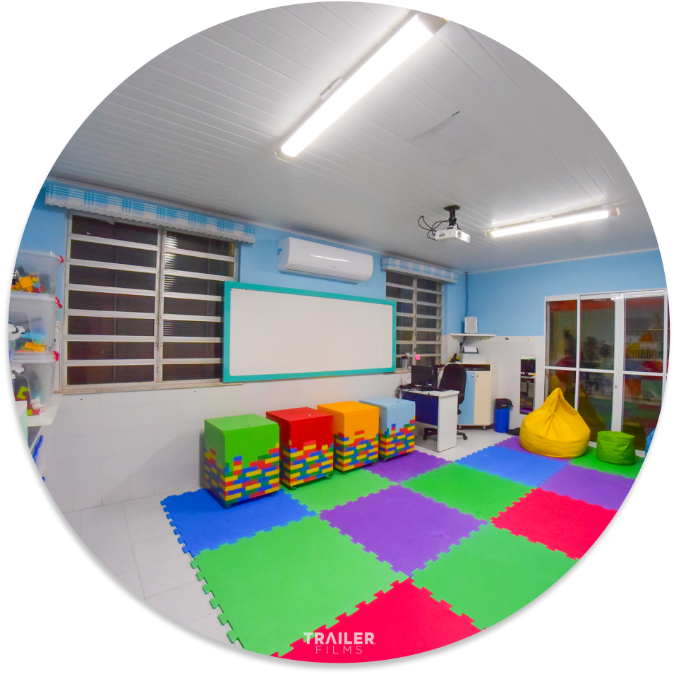 Sala climatizada e equipada com recursos pedagógicos específicos para a faixa etária